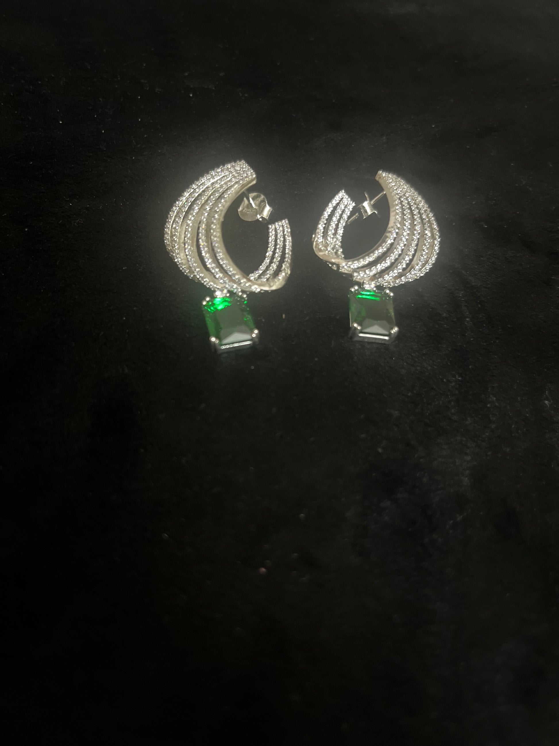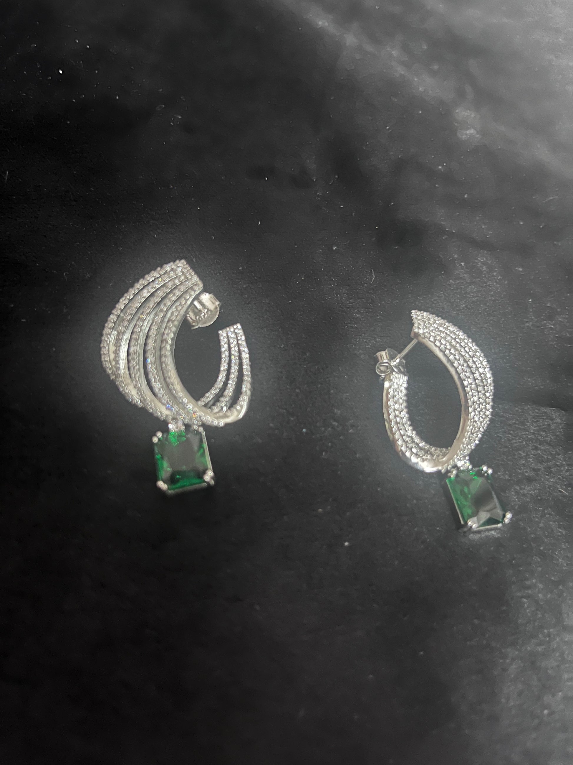 Crafted with precision and elegance, these earrings feature cascading layers of fine silver accented with a brilliant emerald-green stone that radiates grace and modern allure.