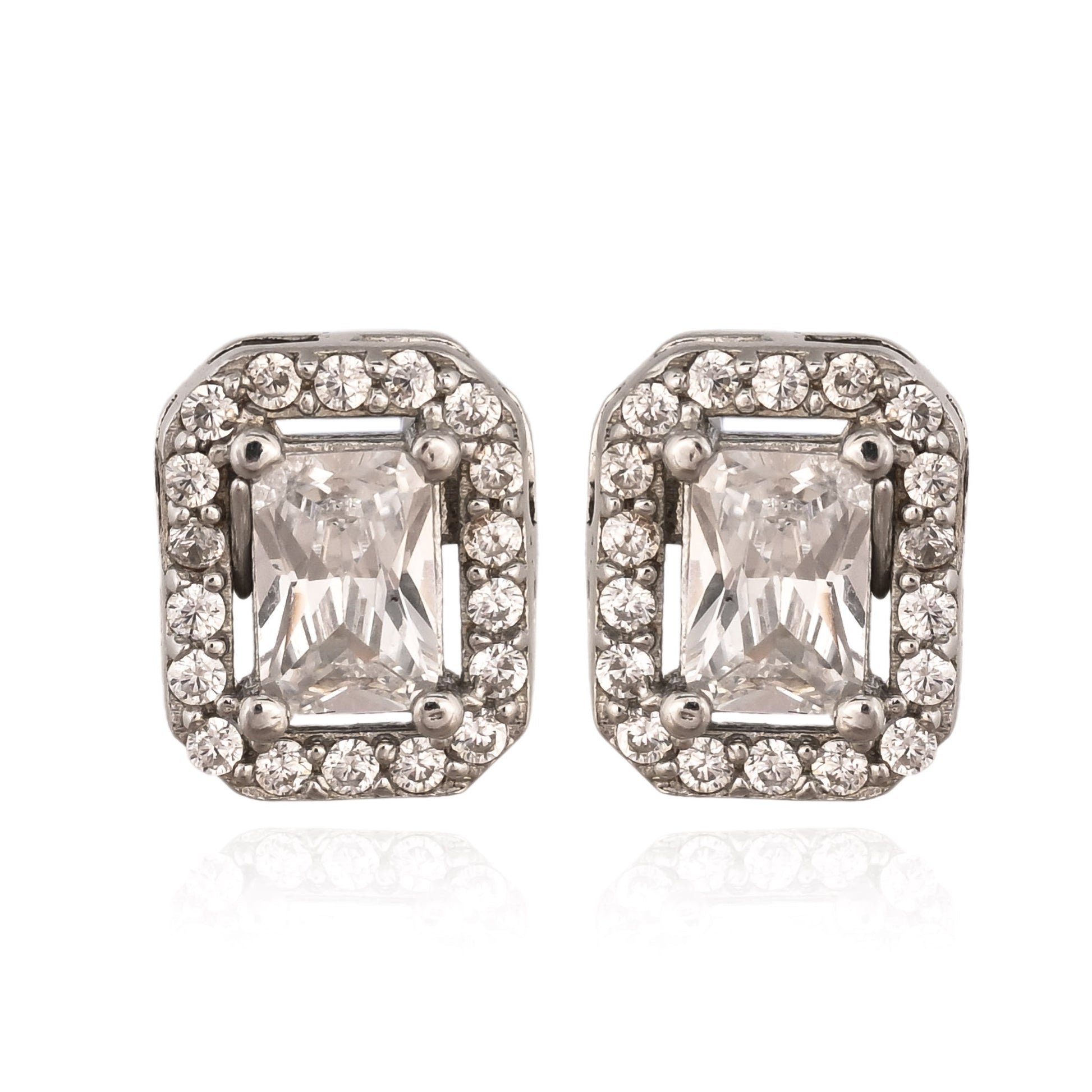 Timeless elegance meets modern design in these handcrafted silver stud earrings. Featuring a sparkling emerald-cut centerpiece surrounded by a halo of shimmering stones, this pair captures sophistication in its purest form.