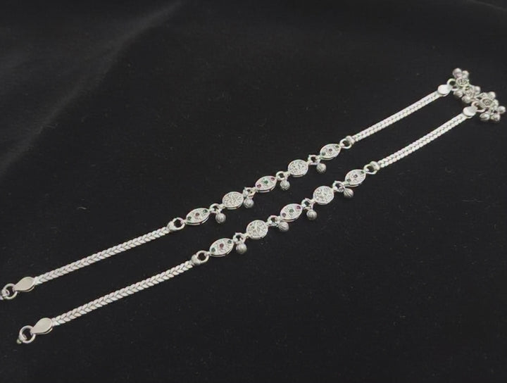 Elegant Silver Anklet with Green & Pink CZ Stones | Traditional Payal for Women | Rasvi Jewels